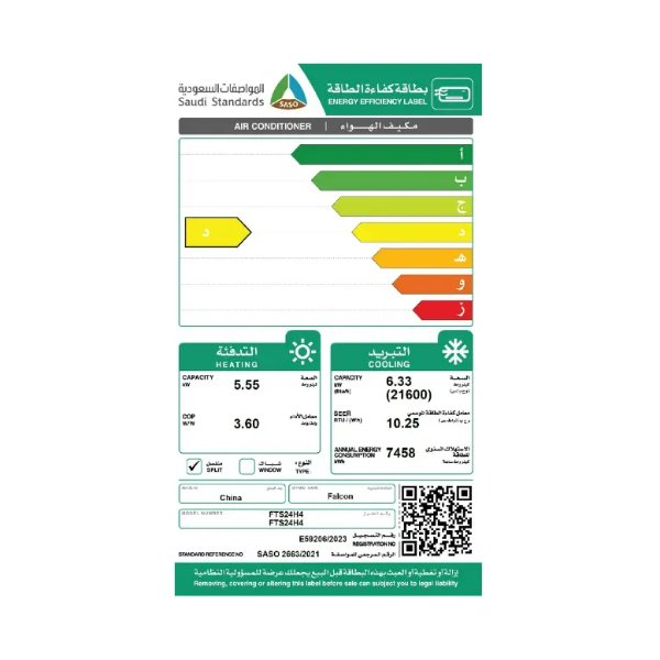مواصفات مكيف سبليت فالكون 21600 وحده حار/ بارد تشخيص ذاتى للأعطال – FTS24H4